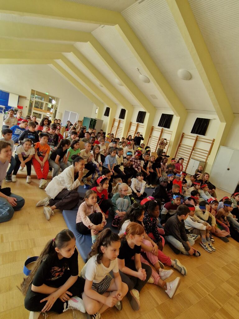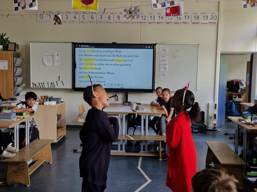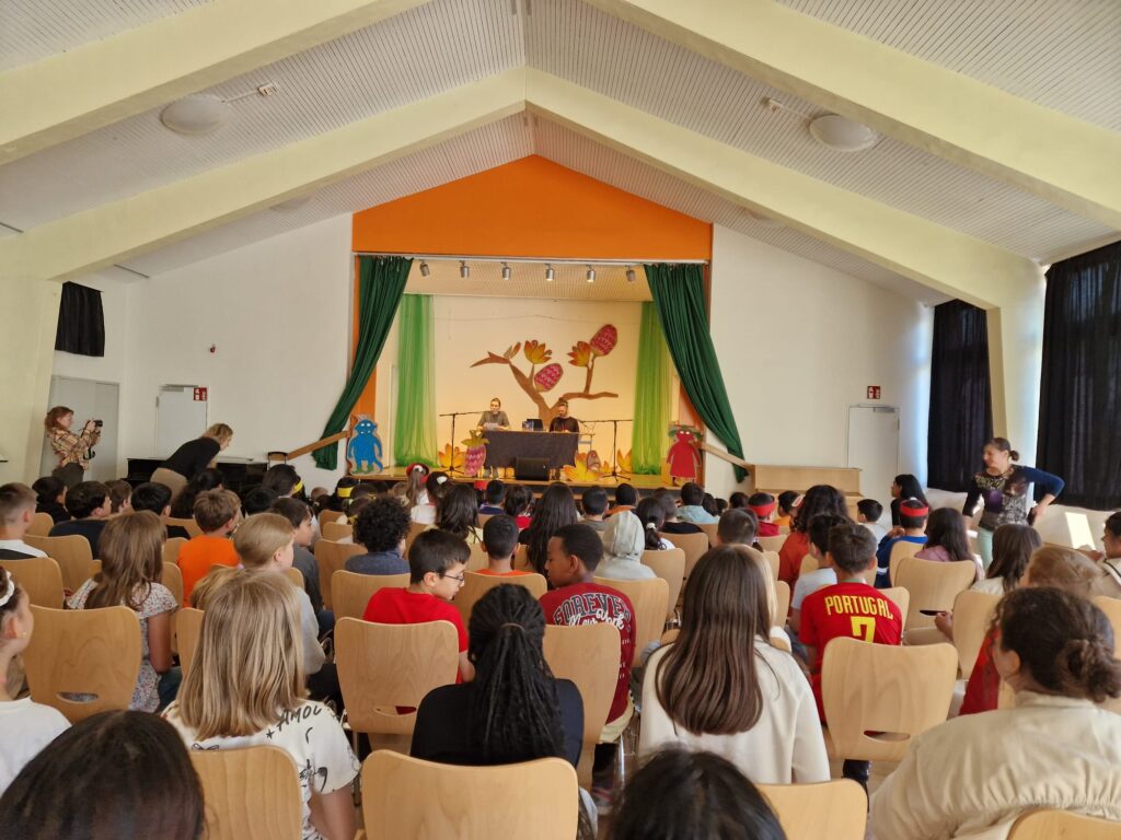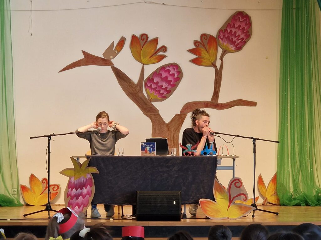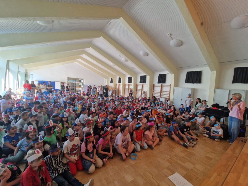 Wir trafen uns in der Aula und sangen gemeinsam unseren Kanon zum Buch: